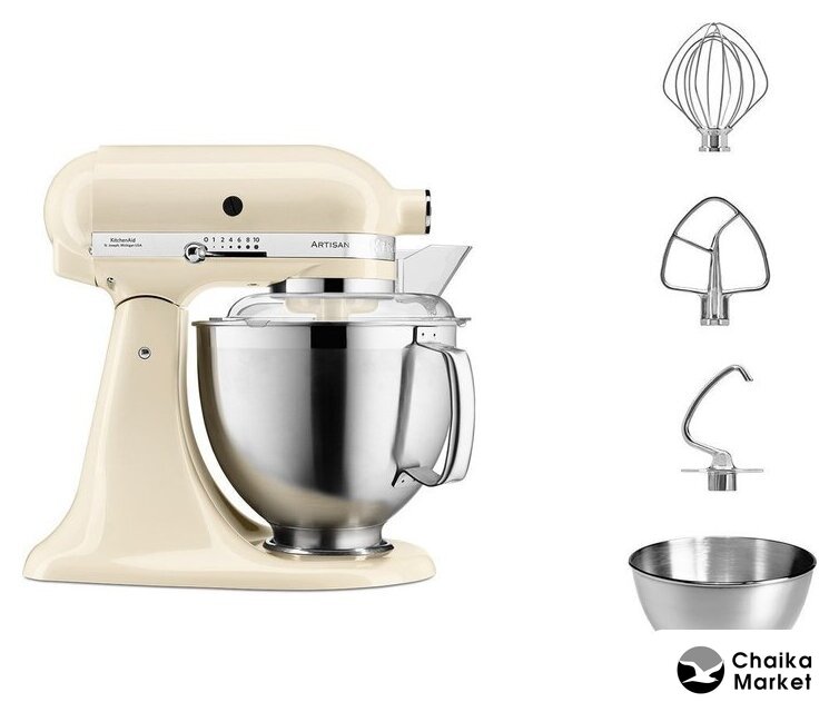 Полная комплектация | чаша из нержавеющей стали объемом 4,8 л;чаша из нержавеющей стали объемом 3 л;прозрачный защитный обод;венчик;крюк для теста;насадка для смешивания |