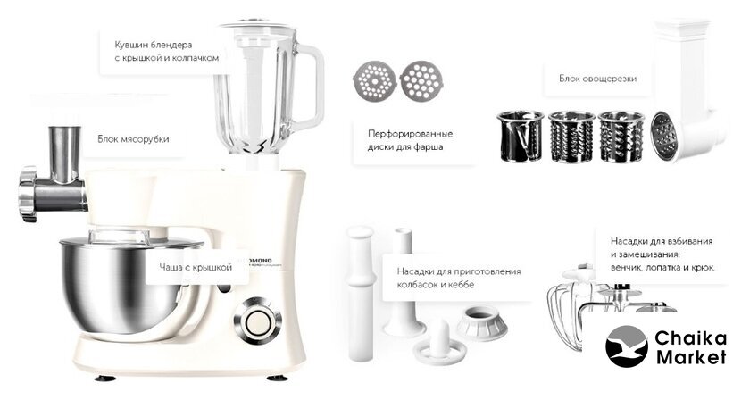 1200 Вт, планетарное смешивание, объем чаши: 5 л, терки, мясорубка, блендер