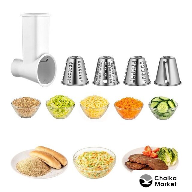 Полная комплектация | Стеклянная чаша блендера 1,5лЧаша миксера 5лДве насадки для смешиванияНасадка для тестаВенчикМясорубка с насадками для регулировки степени измельчения, набивки колбас, изготовления пасты и насадкой-шаблоном для формовки печеньяТолкательОвощерезка с 4 терками (мелкая терка, крупная терка, измельчение, нарезка ломтиками)Миксер для смузи 0,6л с крышкой для использования в качестве дорожной бутылки |