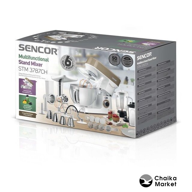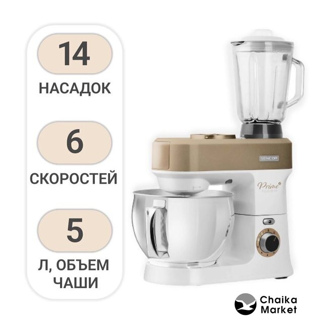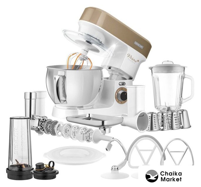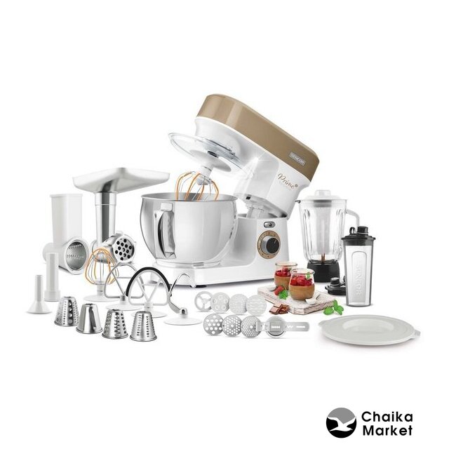 1200 Вт, планетарное смешивание, объем чаши: 5.5 л, терки, мясорубка, блендер