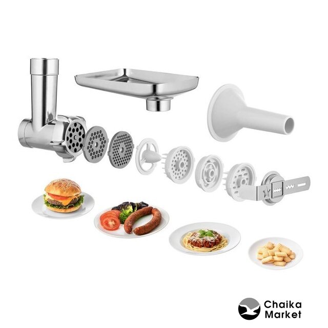 Полная комплектация | Стеклянная чаша блендера 1,5лЧаша миксера 5лДве насадки для смешиванияНасадка для тестаВенчикМясорубка с насадками для регулировки степени измельчения, набивки колбас, изготовления пасты и насадкой-шаблоном для формовки печеньяТолкательОвощерезка с 4 терками (мелкая терка, крупная терка, измельчение, нарезка ломтиками)Миксер для смузи 0,6л с крышкой для использования в качестве дорожной бутылки |