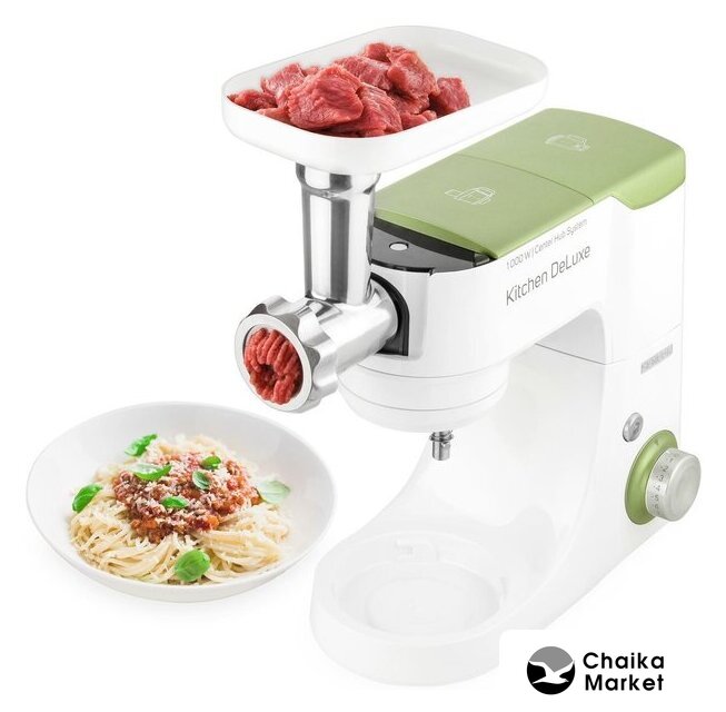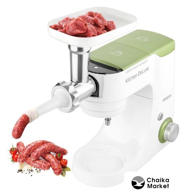 Полная комплектация | крюк для замеса, взбивающий венчик в форме буквы А, сферический венчик для взбивания. Насадка для заполнения копченостей с 2 диаметрами. 2 бутылки из материала Тритан с 2 охлаждающими элементами (ICE STICK). Настольный миксер с титановыми лезвиями объёмом 1,25 л. Многофункциональный кухонный комбайн объемом 1,25 л, с 4 насадками и измельчителем. Мясорубка для грубого и мелкого помола с насадкой для заполнения копченостей с 2 диаметрами. Чаша для замеса объёмом 4,5 литра из нержавеющей стали и измерительной шкалой |