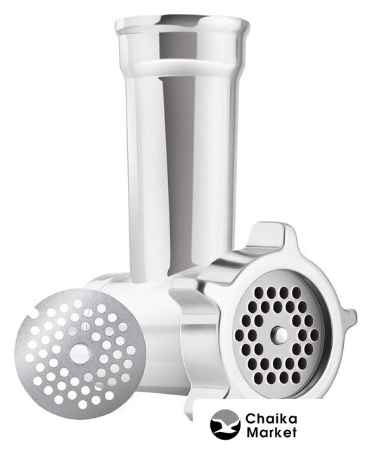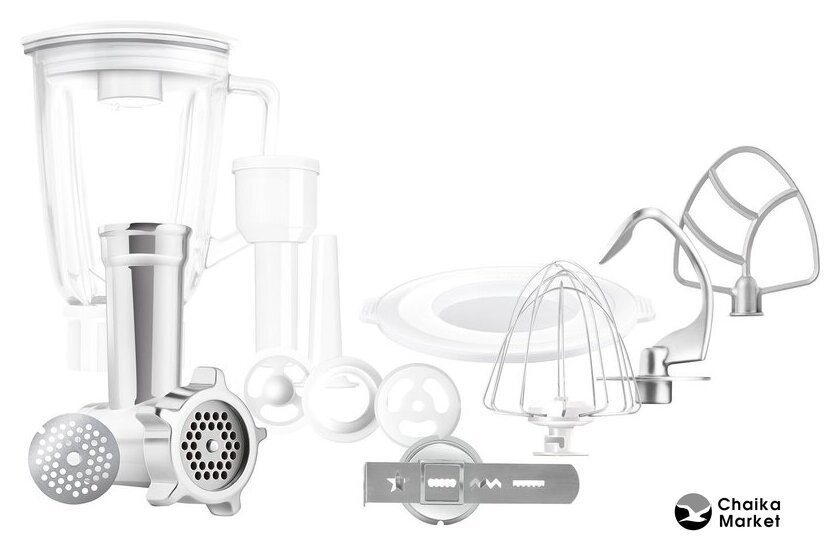 Полная комплектация | Прозрачная крышка чаши с отверстием для добавления продуктов во время смешивания.Пластиковая крышка к чаше из нержавеющей стали для хранения приготовленной смеси.Блендер: 1.5 л.Мясорубка: 2 решетки, насадка для колбас, кеббе, толкатель.3 насадки для замеса, взбивания и жидкого теста: крюк для замеса, насадка для смешивания в форме буквы А, венчик для взбивания.Специальная гибкая насадка FLEXI для замеса мягкого теста.Формочка для печенья. |