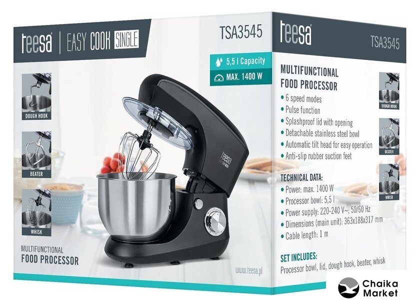 1400 Вт, планетарное смешивание, объем чаши: 4.5 л, терки, мясорубка, блендер