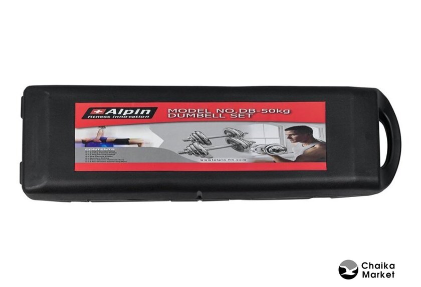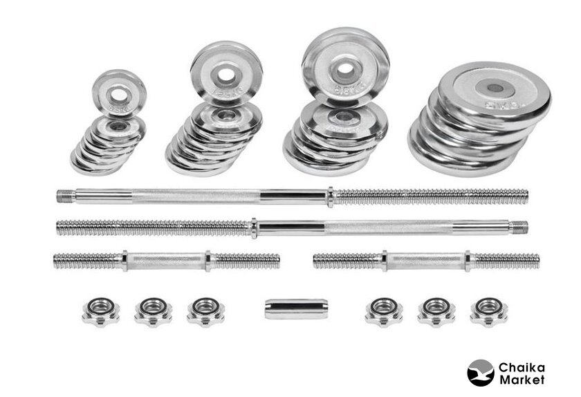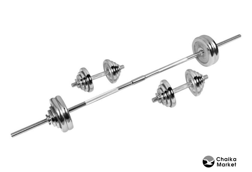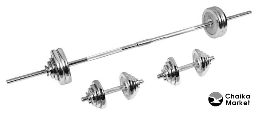 набор гантелей с грифом для штанги, вес снаряда 50 кг, конструкция: разборная, посадочный 26 мм, длина 35 см