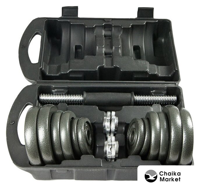 | Комплектация | - 2 грифа диаметром 26 мм, длиной 35 см (длина резьбы 11 см с каждой стороны)- 4 зажима- 4 диска х 0,5 кг (диаметр 9,0см, ширина 1,4 см) - 4 диска х 1,25 кг (диаметр 12 см, ширина 1,8 см) - 4 диска х 2,5 кг (диаметр 14,5 см, ширина 2,2 см) |