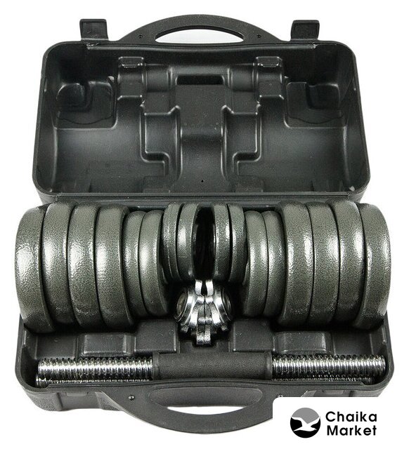 | Комплектация | - 2 грифа диаметром 26 мм, длиной 35 см (длина резьбы 11 см с каждой стороны)- 4 зажима- 4 диска х 0,5 кг (диаметр 9,0см, ширина 1,4 см) - 4 диска х 1,25 кг (диаметр 12 см, ширина 1,8 см) - 8 дисков х 2,5 кг (диаметр 14,5 см, ширина 2,2 см) |