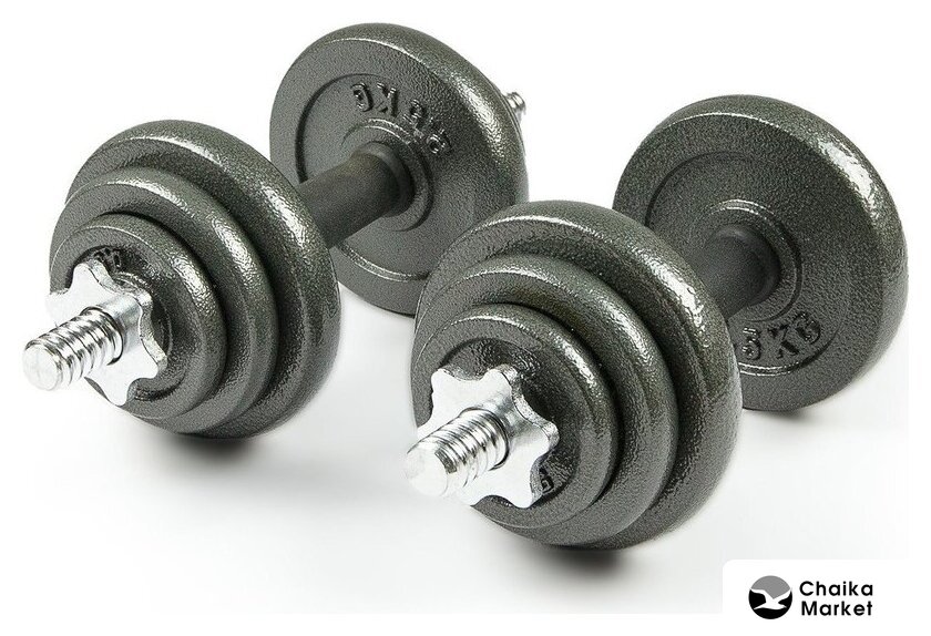 Комплектация | - 2 грифа диаметром 26 мм, длиной 35 см (длина резьбы 11 см с каждой стороны) и весом 1,35 кг- 4 зажима, которые обеспечивают точные нагрузки давления- 4 диска х 0,5 кг (диаметр 9,0см, ширина 1,4 см)- 4 диска х 1,25 кг (диаметр 12 см, ширина 1,8 см)- 4 диска х 2,5 кг (диаметр 14,5 см, ширина 2,2 см)- 1 соединительный гриф |