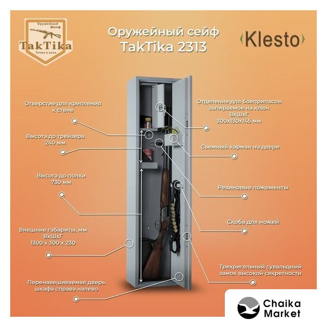 оружейный, объём: 89 л, ключевой, электронный, взломостойкий замок, 300×1300×230 мм, 20 кг