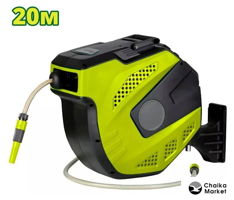 катушка со шлангом с распылителем, пластик, гладкая поверхность, диаметр 12.7 мм, длина 20 м, серый/черный