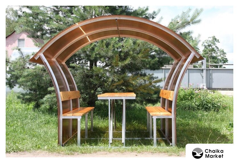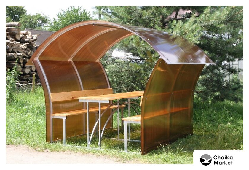 металлический каркас, прямоугольная, скамья, стол, крыша поликарбонат, настил пола: нет, 3x2.53 м