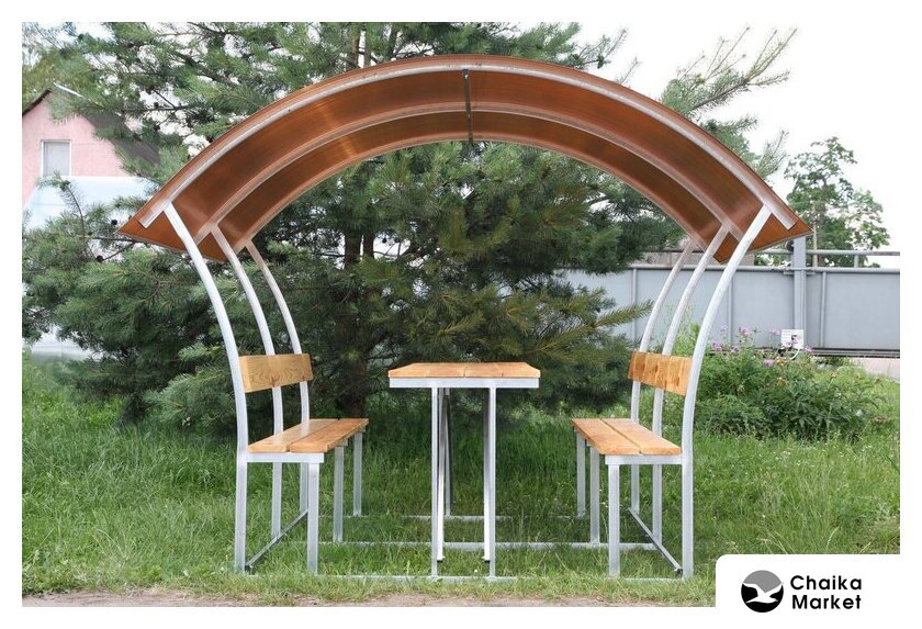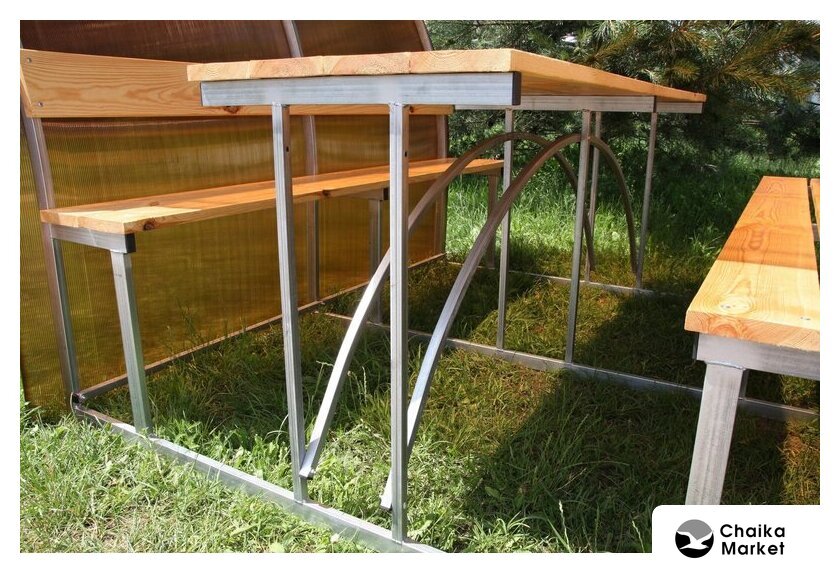 металлический каркас, прямоугольная, скамья, стол, крыша поликарбонат, настил пола: нет, 3x1.73 м