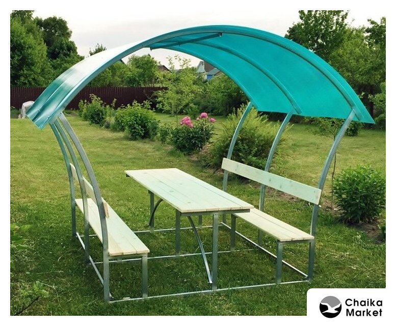 металлический каркас, прямоугольная, скамья, стол, крыша поликарбонат, настил пола: нет, 3x1.73 м
