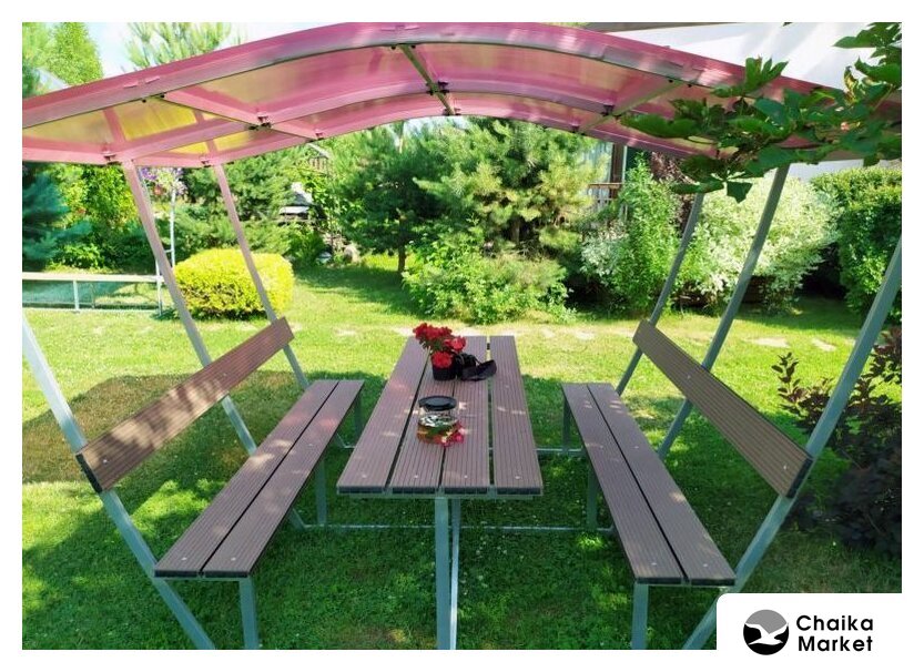 металлический каркас, прямоугольная, скамья, стол, крыша поликарбонат, настил пола: нет, 3x2.53 м