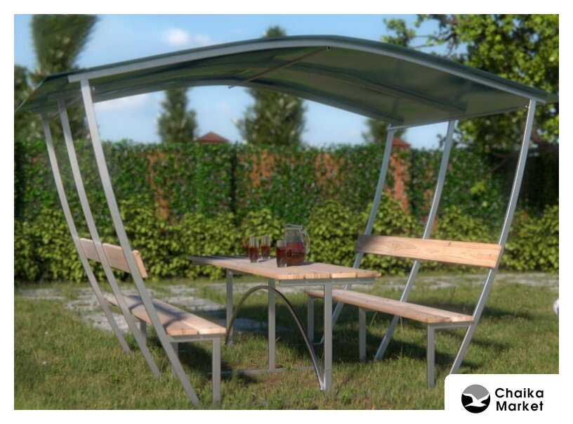 металлический каркас, прямоугольная, скамья, стол, крыша поликарбонат, настил пола: нет, 3x2.53 м