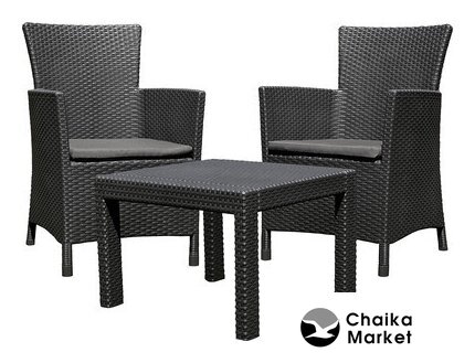 стол + 2 стула, стол: 590×590×430 мм, основание - пластик/искусственный ротанг, столешница - искусственный ротанг, сиденье: 620×600 мм, материал: искусственный ротанг