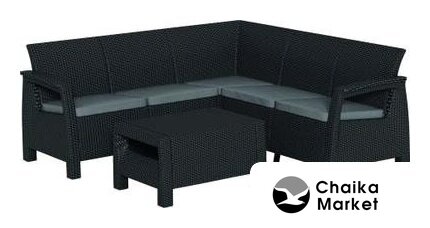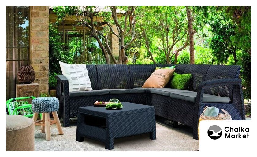 диван + 2 кресла + столик, стол: 590×590×550 мм, основание - искусственный ротанг, столешница - стекло, сиденье: 1050×1050 мм, материал: ткань