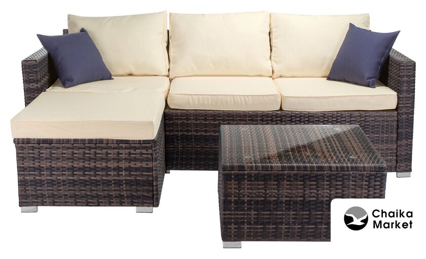 диван + кресло + столик, стол: 1460×850×350 мм, основание - металл, столешница - дерево, сиденье: 1070×750 мм, материал: ткань