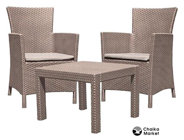 стол + 2 кресла, стол: 590×590×430 мм, основание - искусственный ротанг, столешница - искусственный ротанг, сиденье: 620×600 мм, материал: искусственный ротанг