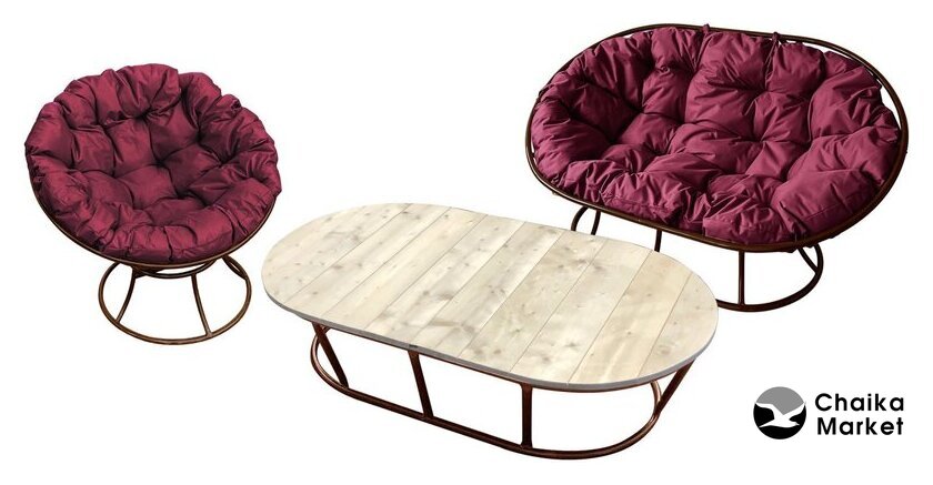 диван + 2 кресла + столик, стол: 770×430×400 мм, основание - искусственный ротанг/сталь, столешница - стекло, сиденье: 570×600 мм, материал: искусственный ротанг