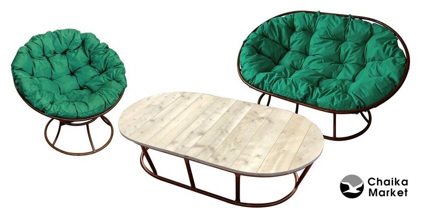 диван + 2 кресла + столик, стол: 770×430×400 мм, основание - искусственный ротанг/сталь, столешница - стекло, сиденье: 570×600 мм, материал: искусственный ротанг