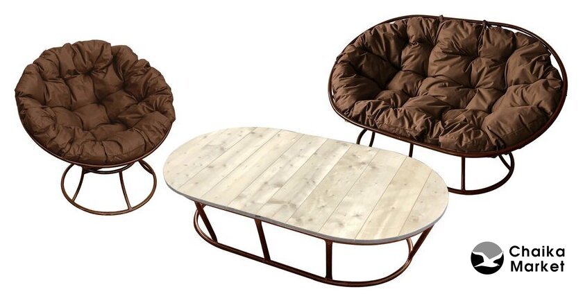 диван + 2 кресла + столик, стол: 770×430×400 мм, основание - искусственный ротанг/сталь, столешница - стекло, сиденье: 570×600 мм, материал: искусственный ротанг