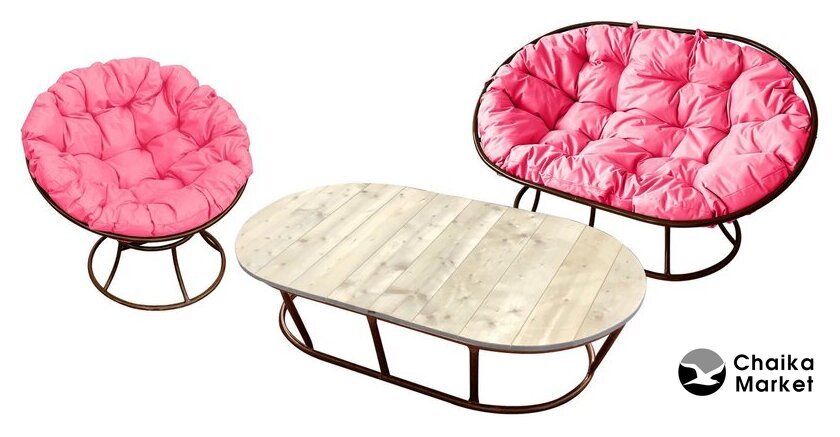 диван + 2 кресла + столик, стол: 770×430×400 мм, основание - искусственный ротанг/сталь, столешница - стекло, сиденье: 570×600 мм, материал: искусственный ротанг