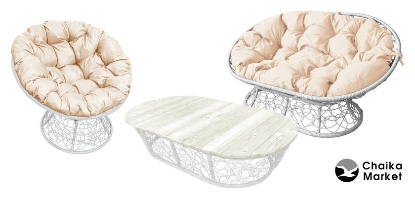 диван + 2 кресла + столик, стол: 600×600×500 мм, основание - искусственный ротанг, столешница - дерево, сиденье: 710×700 мм, материал: ткань