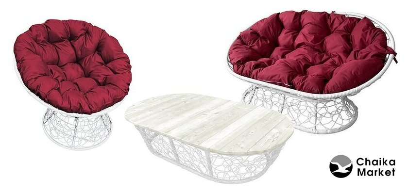 диван + 2 кресла + столик, стол: 600×600×500 мм, основание - искусственный ротанг, столешница - дерево, сиденье: 710×700 мм, материал: ткань