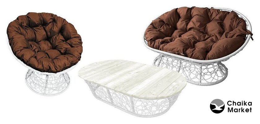диван + 2 кресла + столик, стол: 600×600×500 мм, основание - искусственный ротанг, столешница - дерево, сиденье: 710×700 мм, материал: ткань