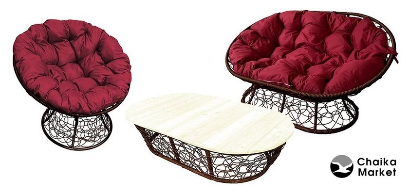 диван + 2 кресла + столик, стол: 600×600×500 мм, основание - искусственный ротанг, столешница - дерево, сиденье: 710×700 мм, материал: ткань