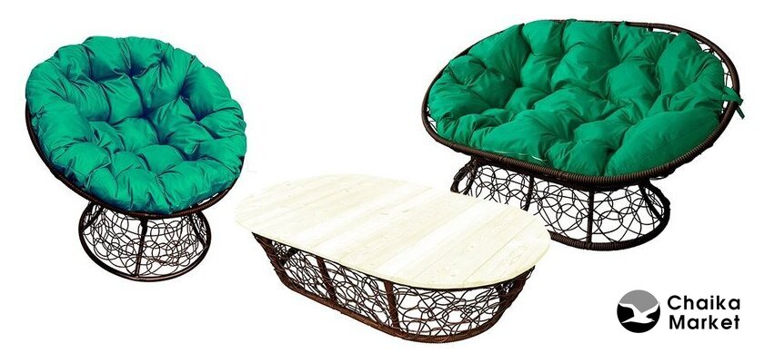диван + кресло + столик, стол: 1460×850×350 мм, основание - металл/искусственный ротанг, столешница - дерево, сиденье: 1070×750 мм, материал: искусственный ротанг