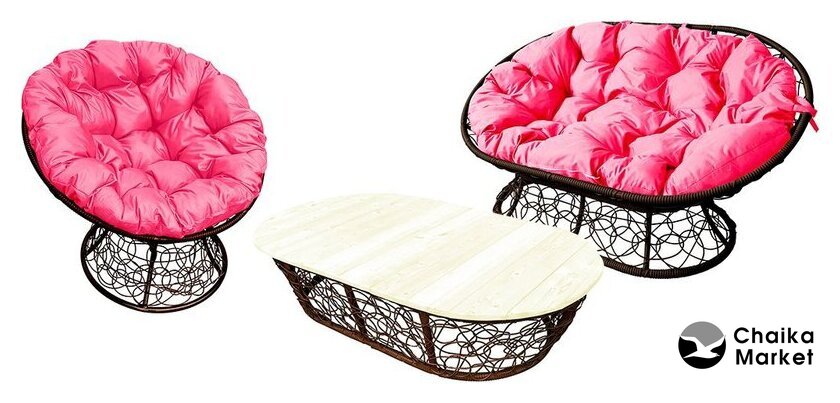 диван + кресло + столик, стол: 1460×850×350 мм, основание - металл/искусственный ротанг, столешница - дерево, сиденье: 1070×750 мм, материал: искусственный ротанг