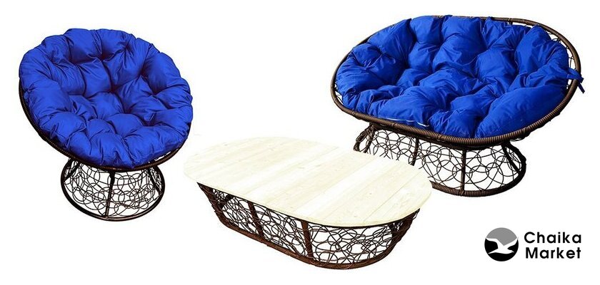 диван + 2 кресла + столик, стол: 600×600×500 мм, основание - искусственный ротанг, столешница - дерево, сиденье: 710×700 мм, материал: ткань