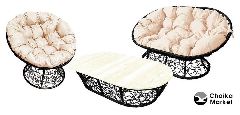 диван + 2 кресла + столик, стол: 600×600×500 мм, основание - искусственный ротанг, столешница - дерево, сиденье: 710×700 мм, материал: ткань