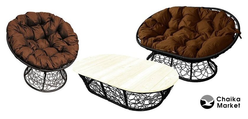 диван + 2 кресла + столик, стол: 600×600×500 мм, основание - искусственный ротанг, столешница - дерево, сиденье: 710×700 мм, материал: ткань