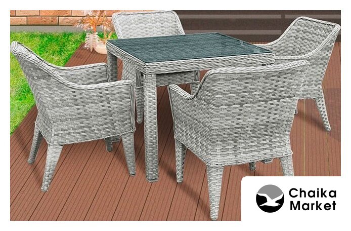 стол + 6 кресел, стол: 1540×770×750 мм, основание - ротанг, столешница - стекло, сиденье: 430×490 мм, материал: ткань