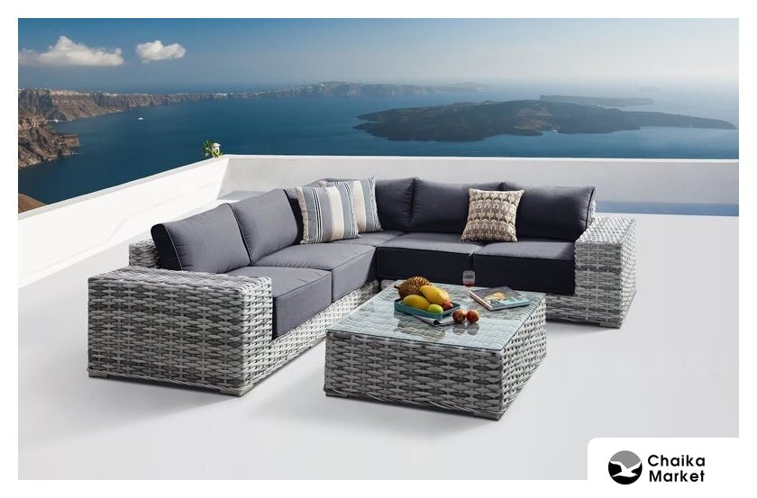 диван + 2 кресла + столик, стол: 1200×600×400 мм, основание - искусственный ротанг/сталь, столешница - стекло, сиденье: 870×820 мм, материал: искусственный ротанг