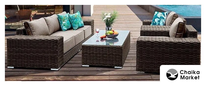 диван + 2 кресла + столик, стол: 1200×600×400 мм, основание - искусственный ротанг/сталь, столешница - стекло, сиденье: 870×820 мм, материал: искусственный ротанг
