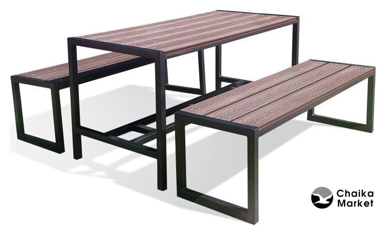стол + 1 скамья + 2 кресла, стол: 1334×770×750 мм, основание - дерево, столешница - дерево, сиденье: 640×590 мм, материал: дерево