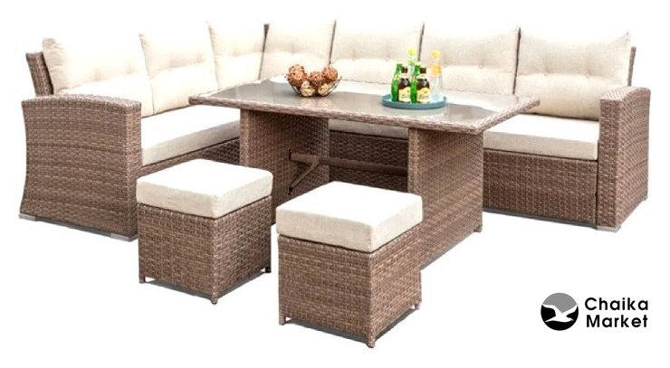стол + 8 стульев, стол: 1800×900×750 мм, основание - искусственный ротанг/сталь, столешница - стекло, сиденье: 530×600 мм, материал: искусственный ротанг