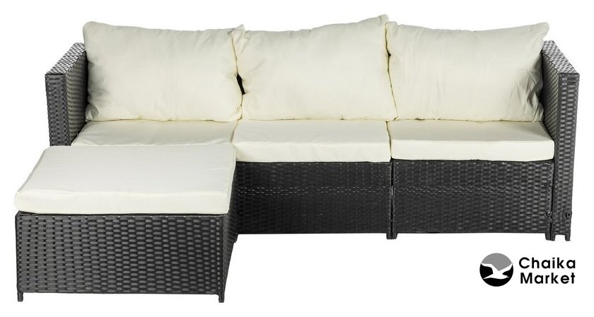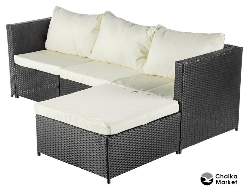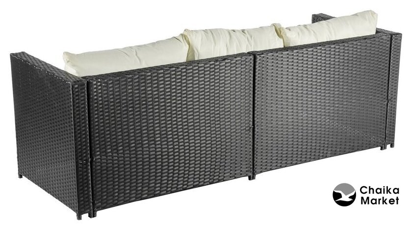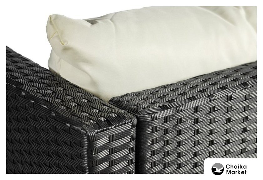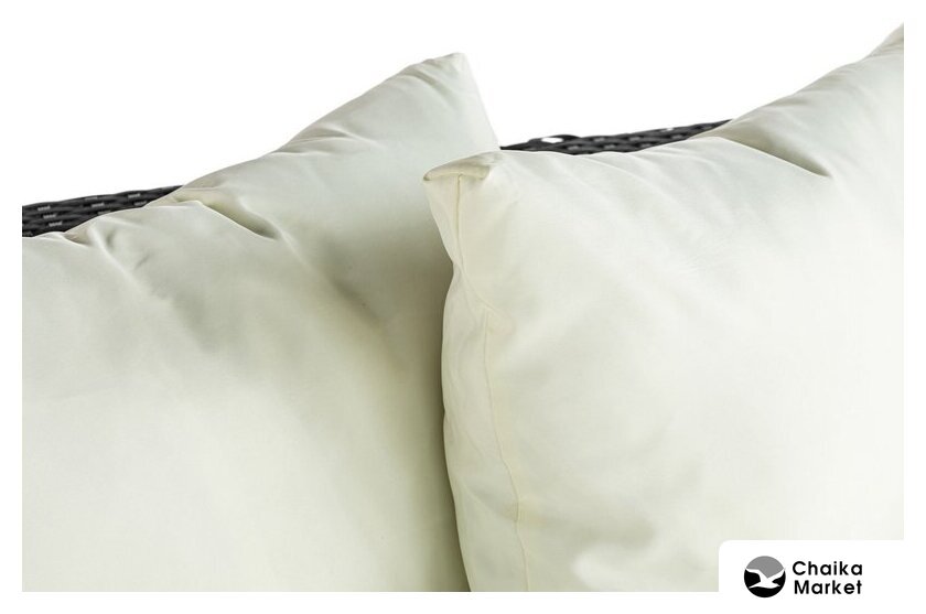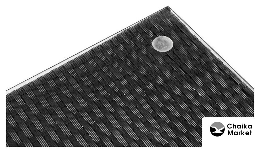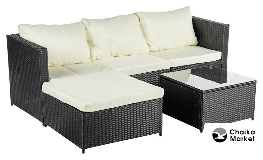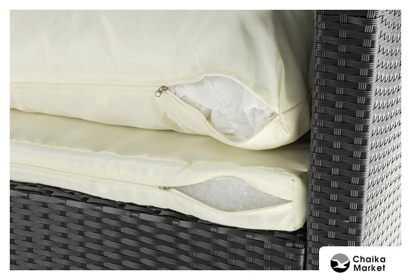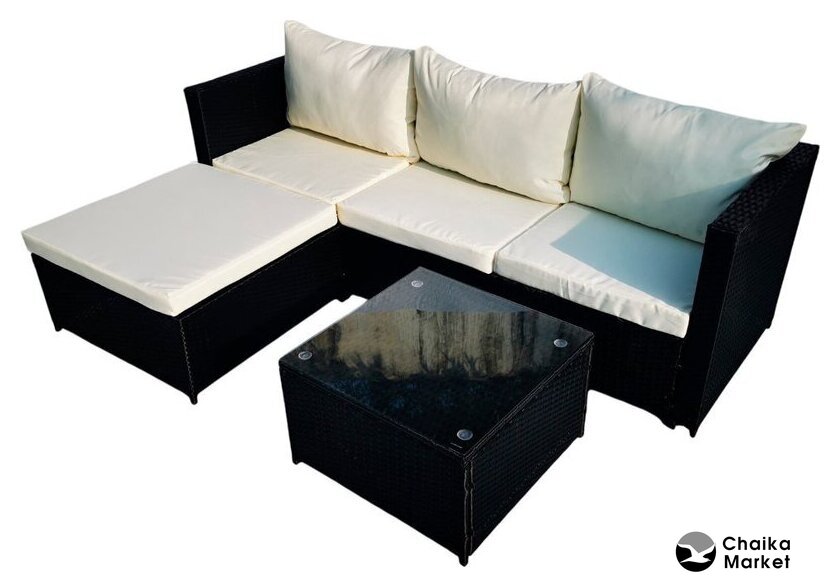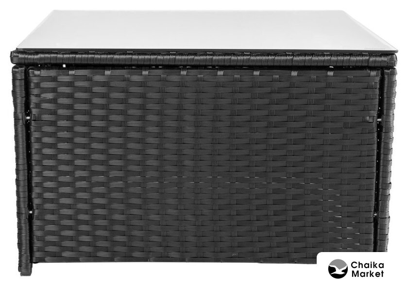 стол + 2 кресла, стол: 600×600×550 мм, основание - ротанг, столешница - стекло, сиденье: 680×630 мм, материал: ткань