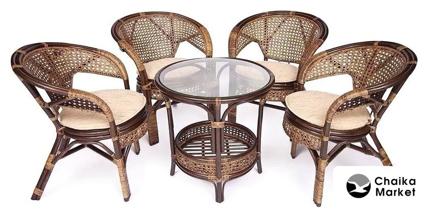 стол + 4 стула, стол: 1334×770×750 мм, основание - дерево, столешница - дерево, сиденье: 640×590 мм, материал: дерево