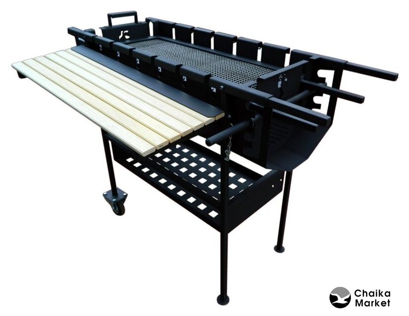 сталь (2 мм), крышка, столики, полка для дров (принадлежностей), колеса, 183x52.4x135.5 см