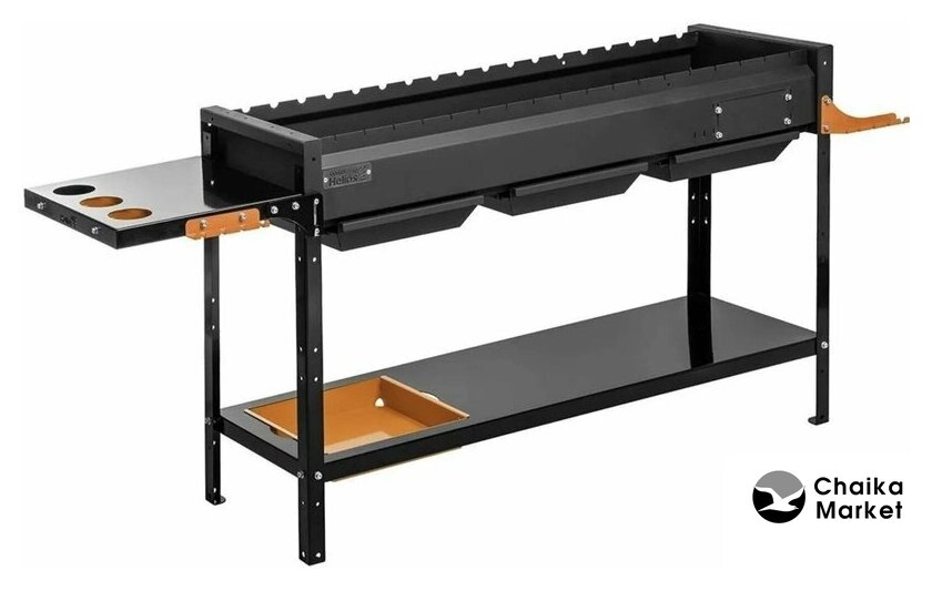 шампуры, гриль-решетка, сталь (2 мм), крышка, столики, полка для дров (принадлежностей), 170x38x90 см