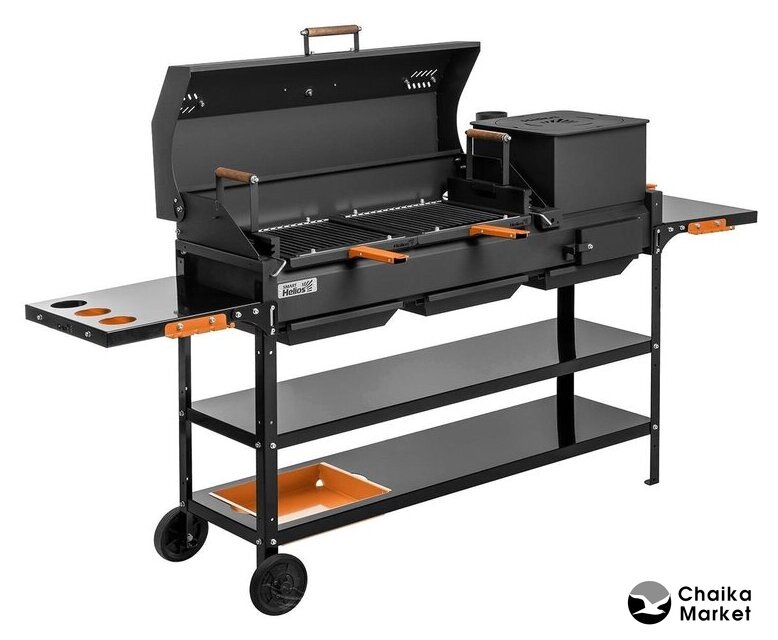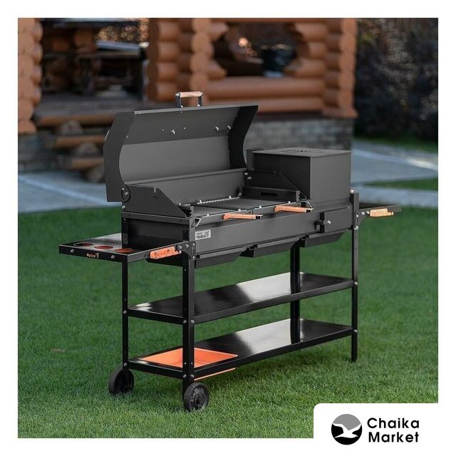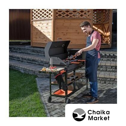 шампуры, гриль-решетка, сталь (3 мм), столики, полка для дров (принадлежностей), 218x40x210 см