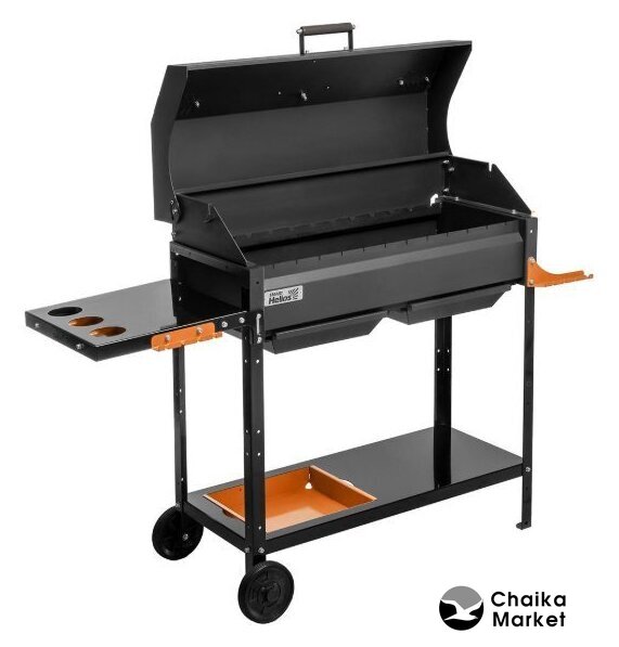 шампуры, гриль-решетка, сталь с жаропрочной эмалью, крышка, столики, полка для дров (принадлежностей), колеса, 134.5x46x102 см