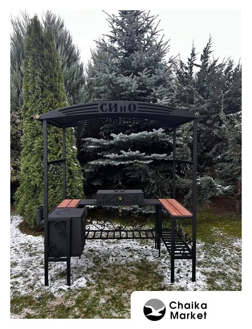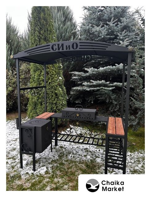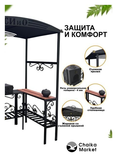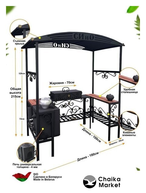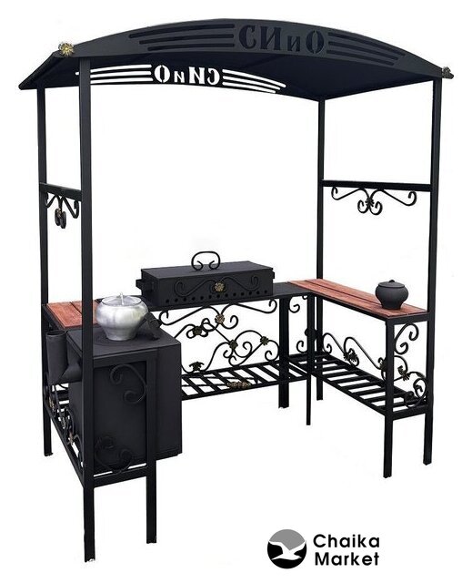 шампуры, гриль-решетка, сталь (3 мм), столики, полка для дров (принадлежностей), 218x40x210 см