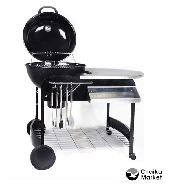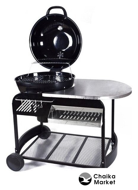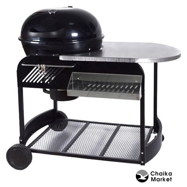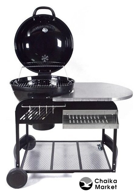 Комплект поставки | держатель шампуров (полка), дровница, золосборник, колеса (4 шт.), крючки для аксессуаров, решетка (1 шт. для барбекю, 1 шт. для угля), столешница (пристолье), встроенный термометр, крышка |