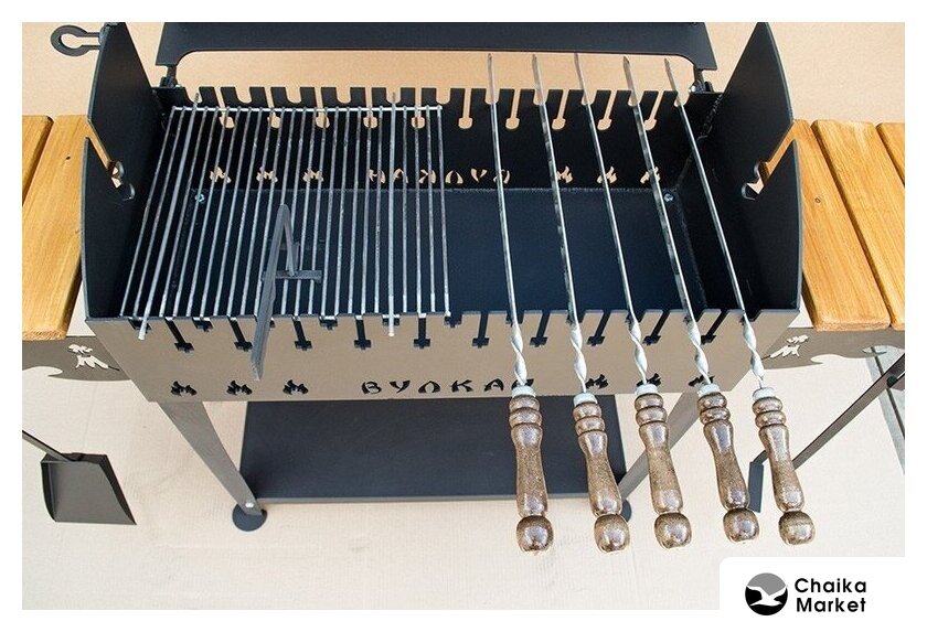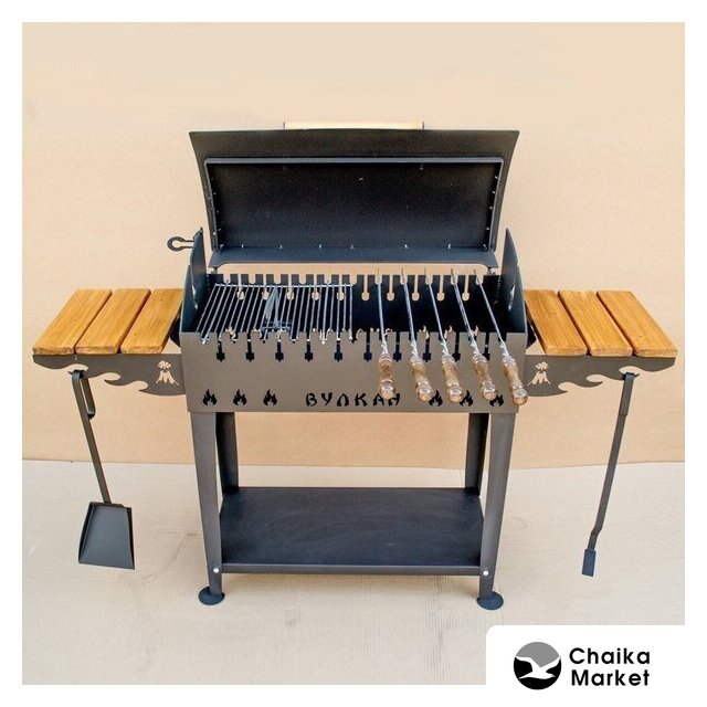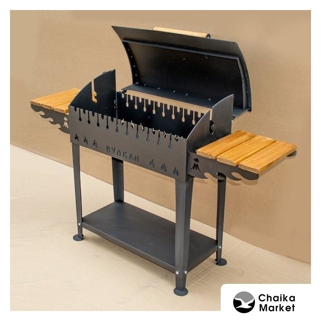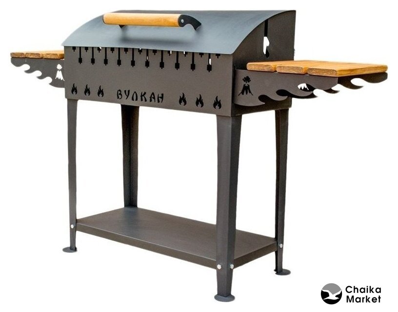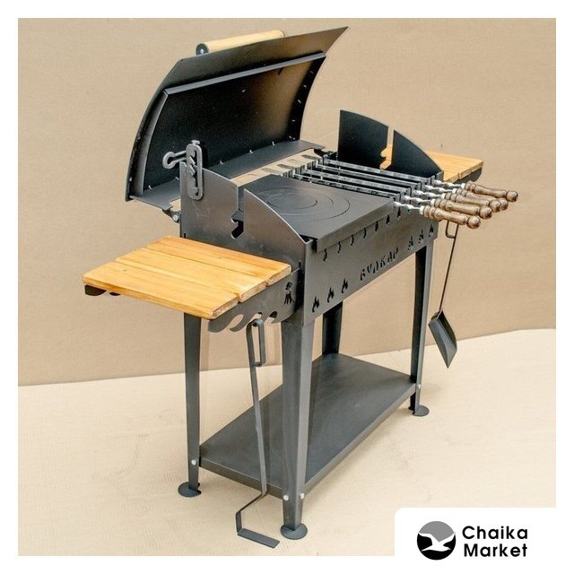 Комплект поставки | жаровня, полка (боковая 2 шт.), ручка, крючки для аксессуаров, ножки (4 шт.), дровница, столешница, крышка |